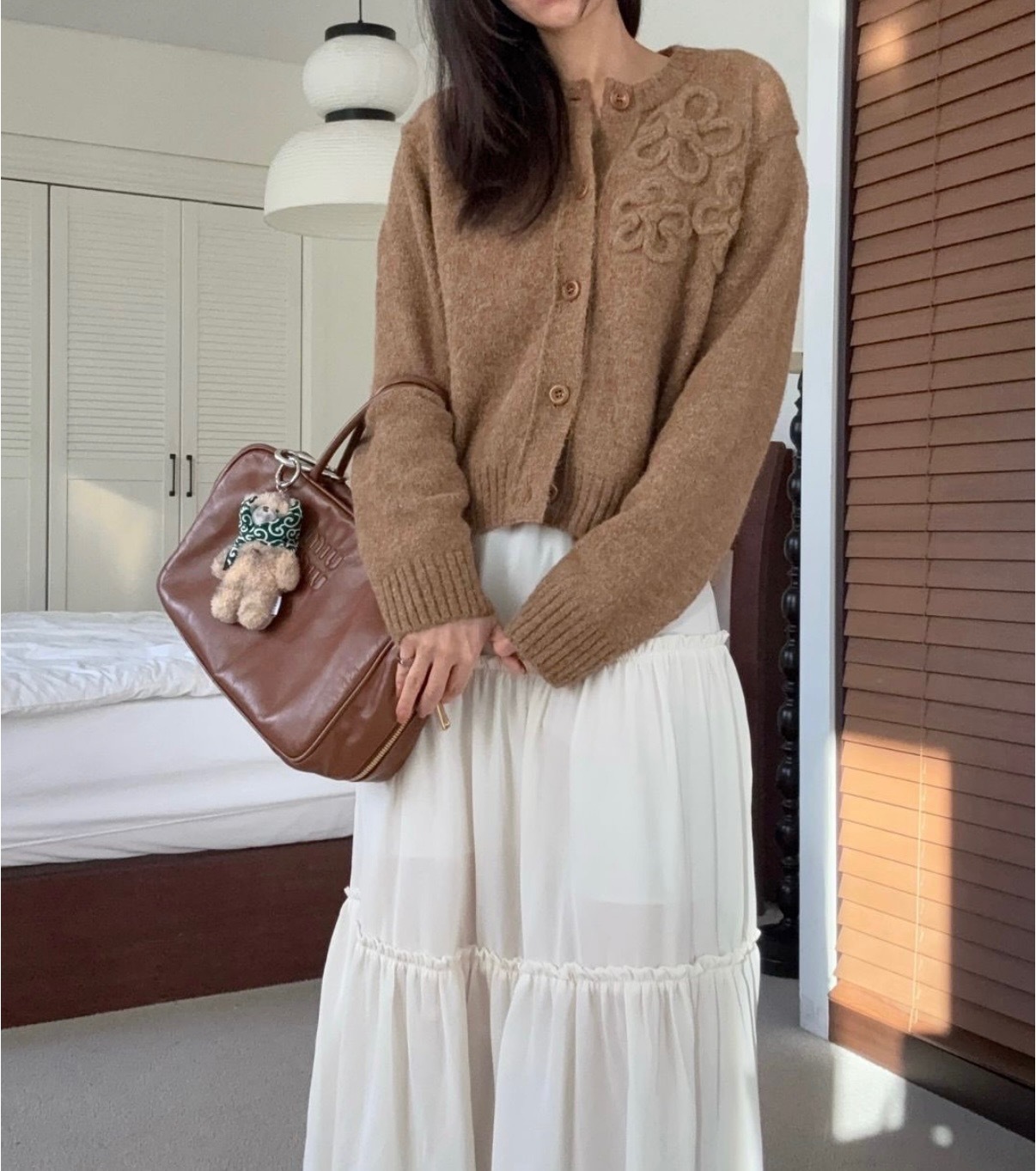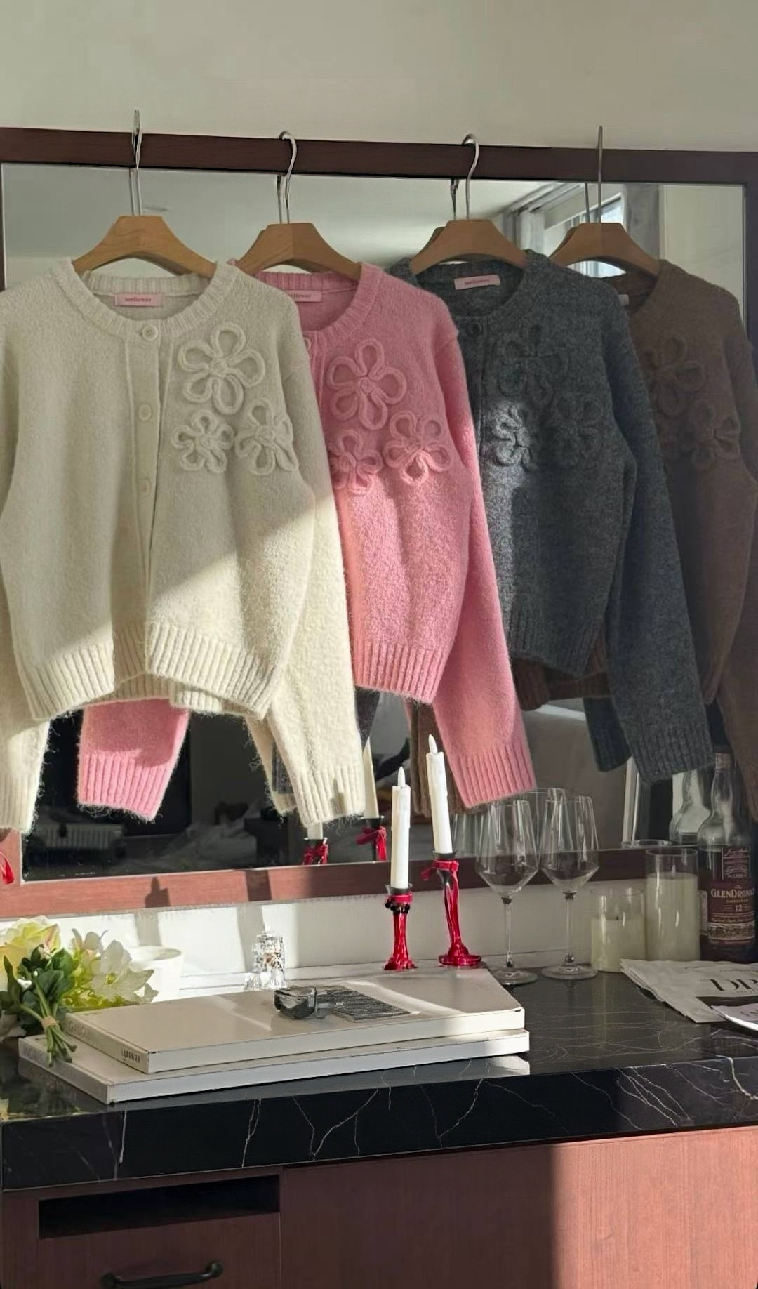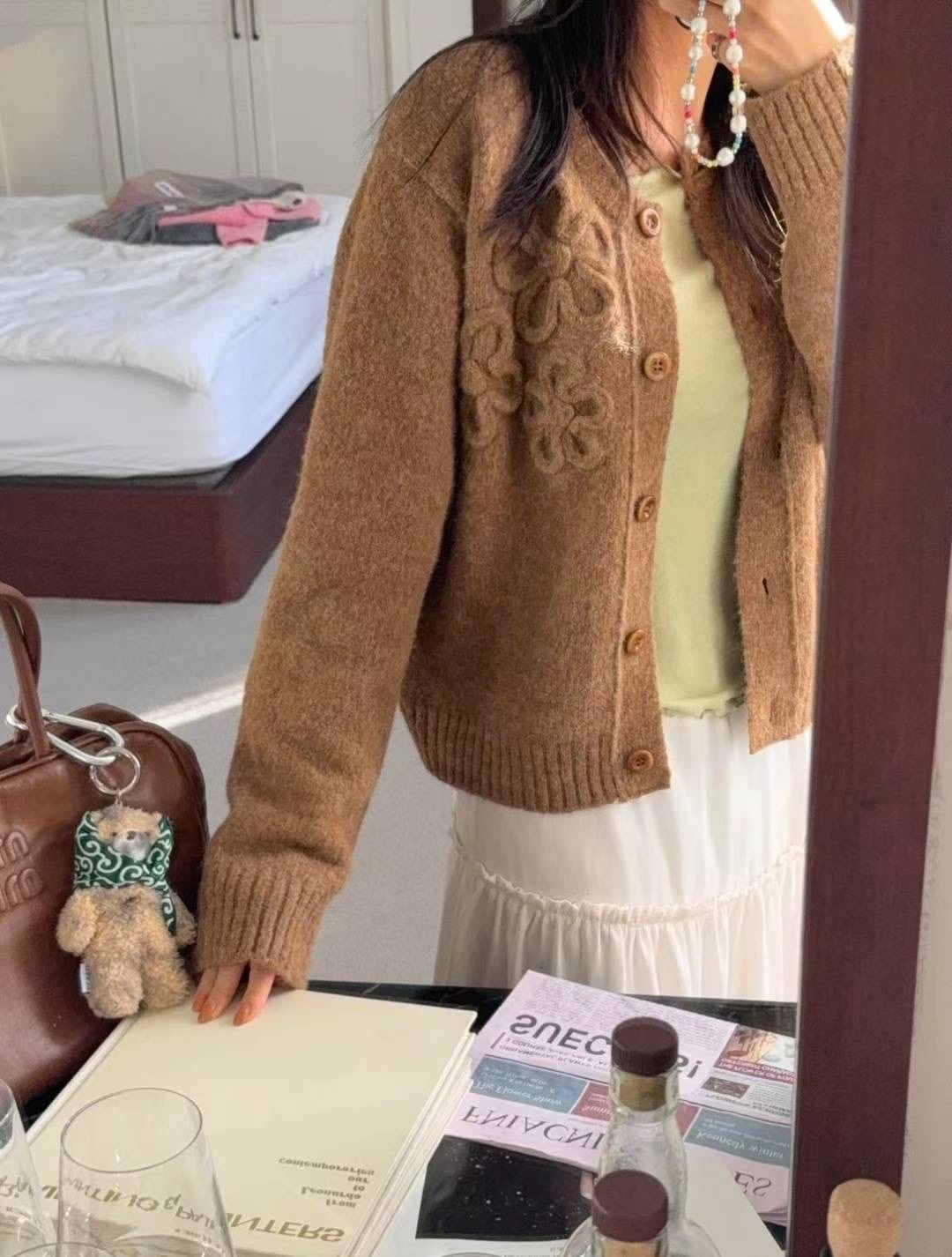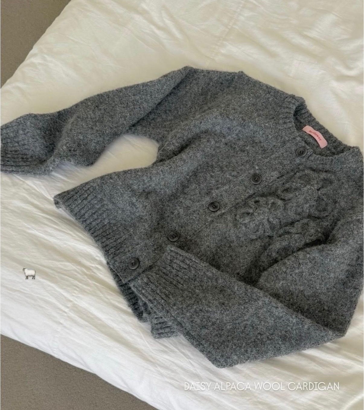 這款開襟衫採用針織紋理,飾以雛菊 刺繡圖案,由羊毛和羊駝毛混紡而成。