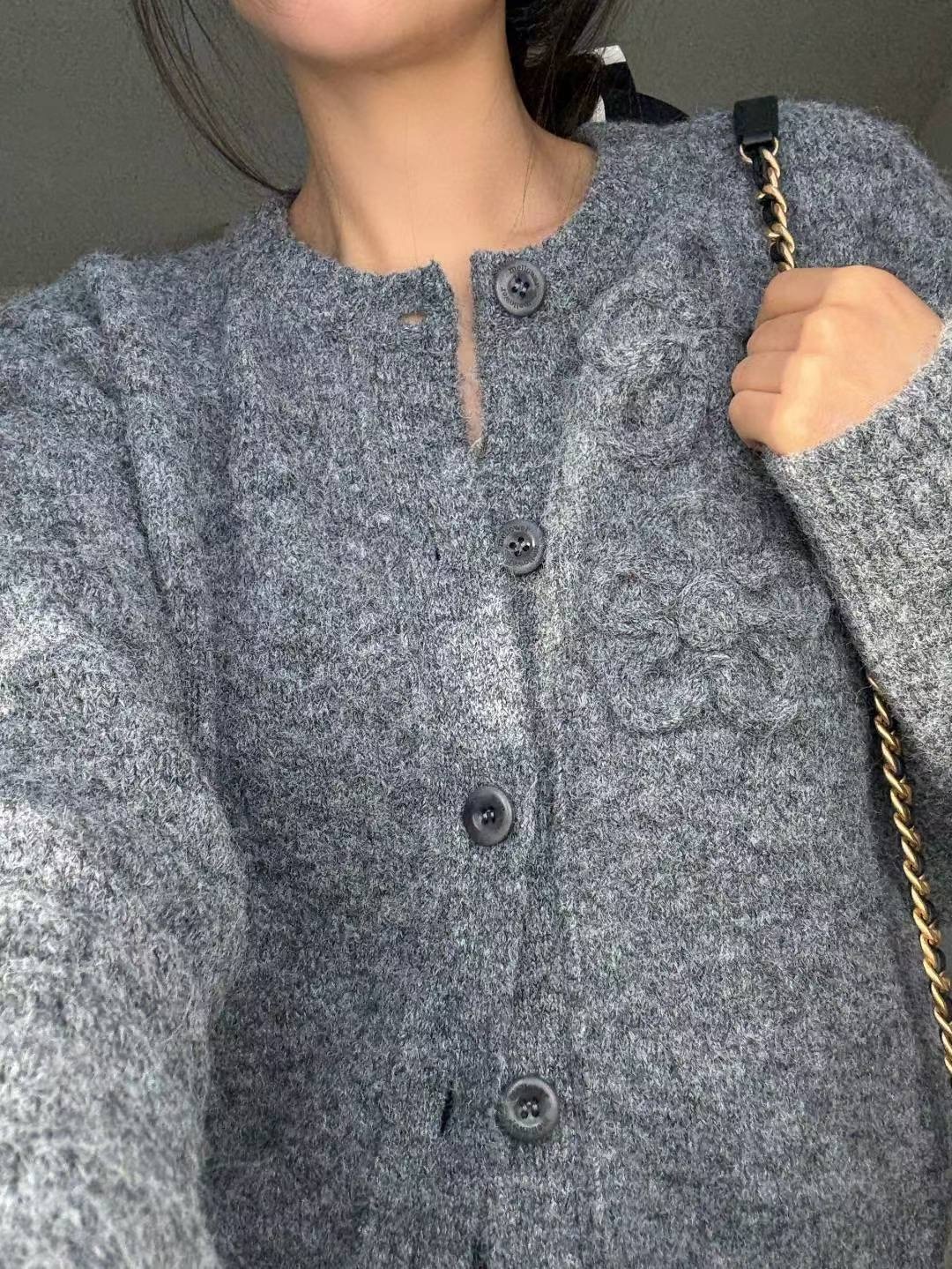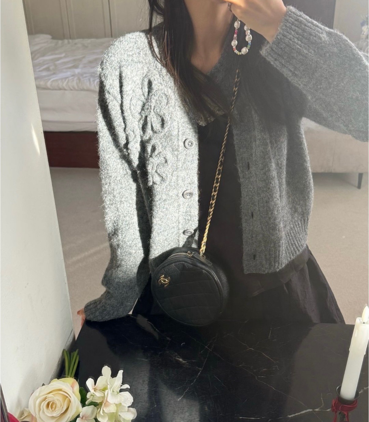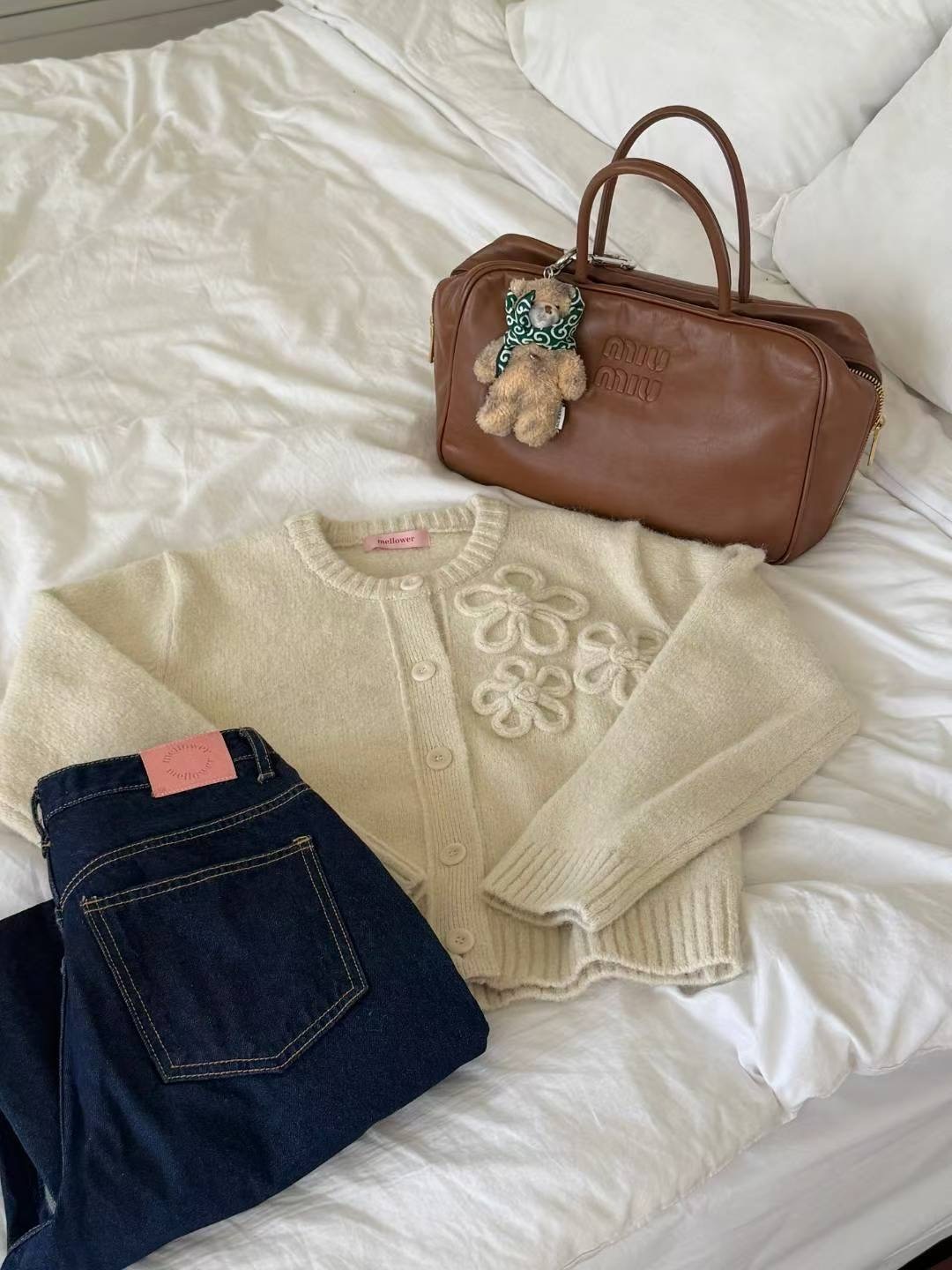 這款開襟衫採用針織紋理,飾以雛菊 刺繡圖案,由羊毛和羊駝毛混紡而成。