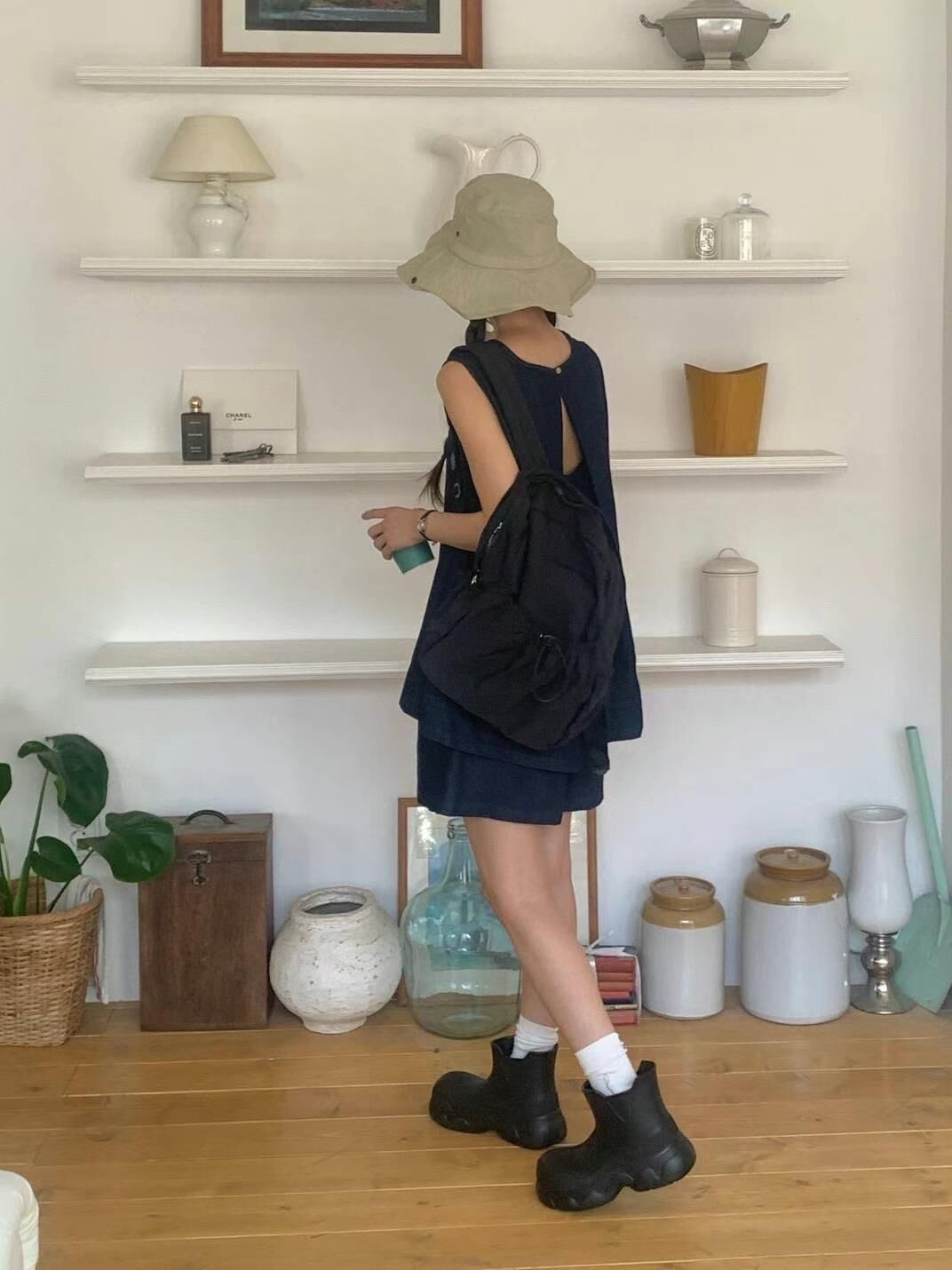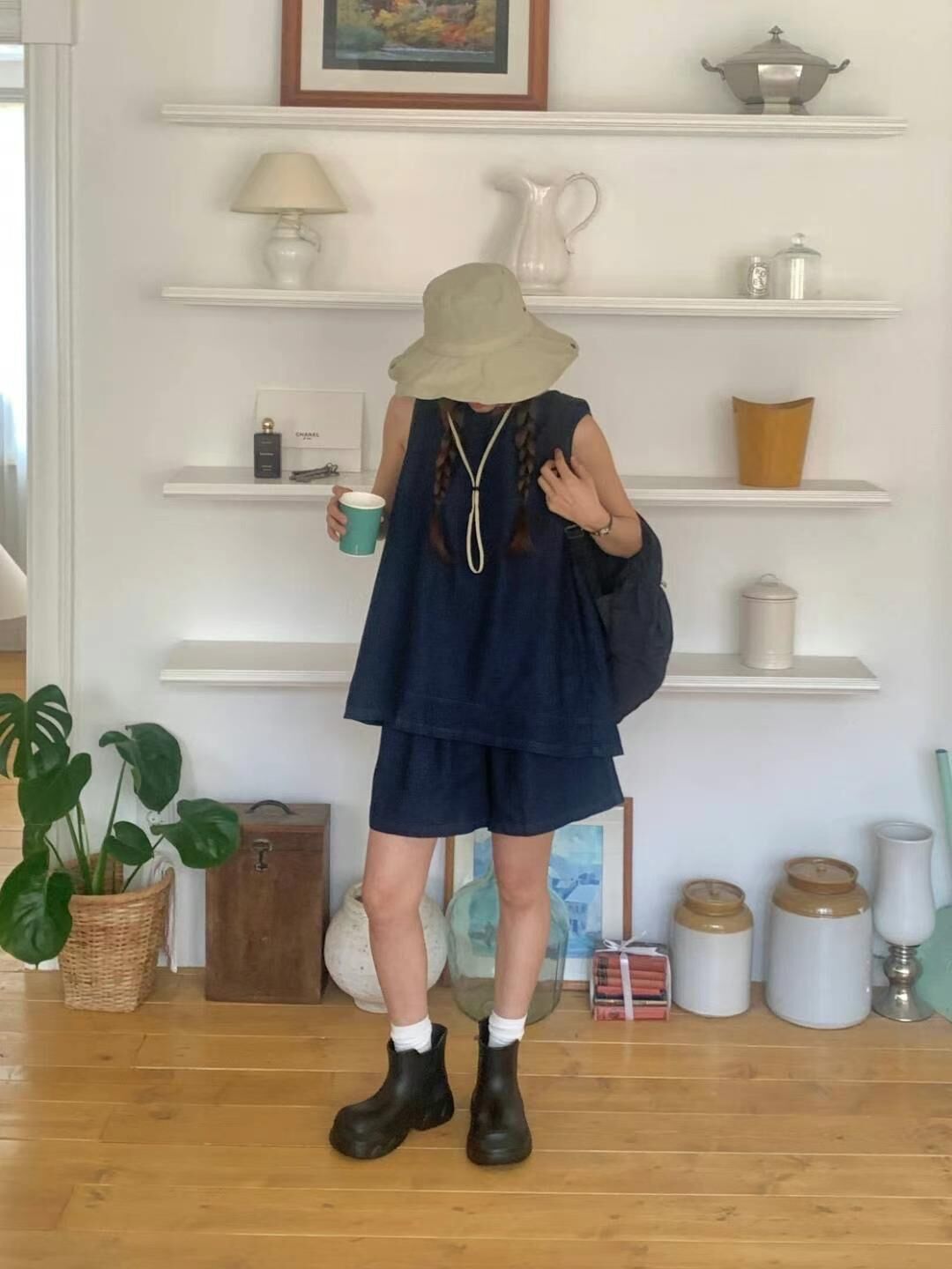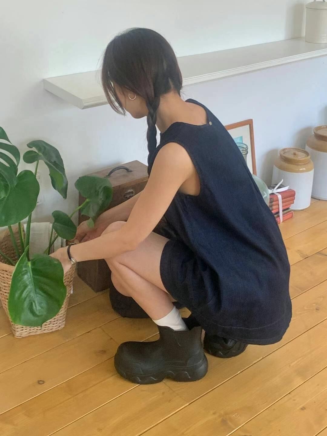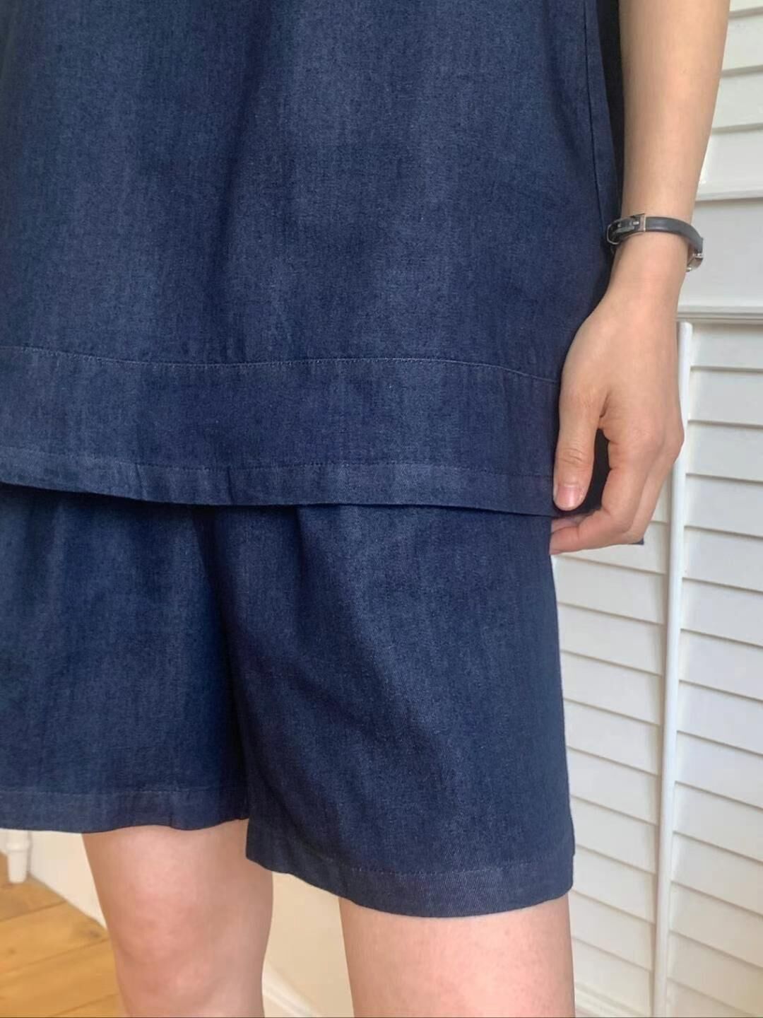 Denim back layered vest & shorts set