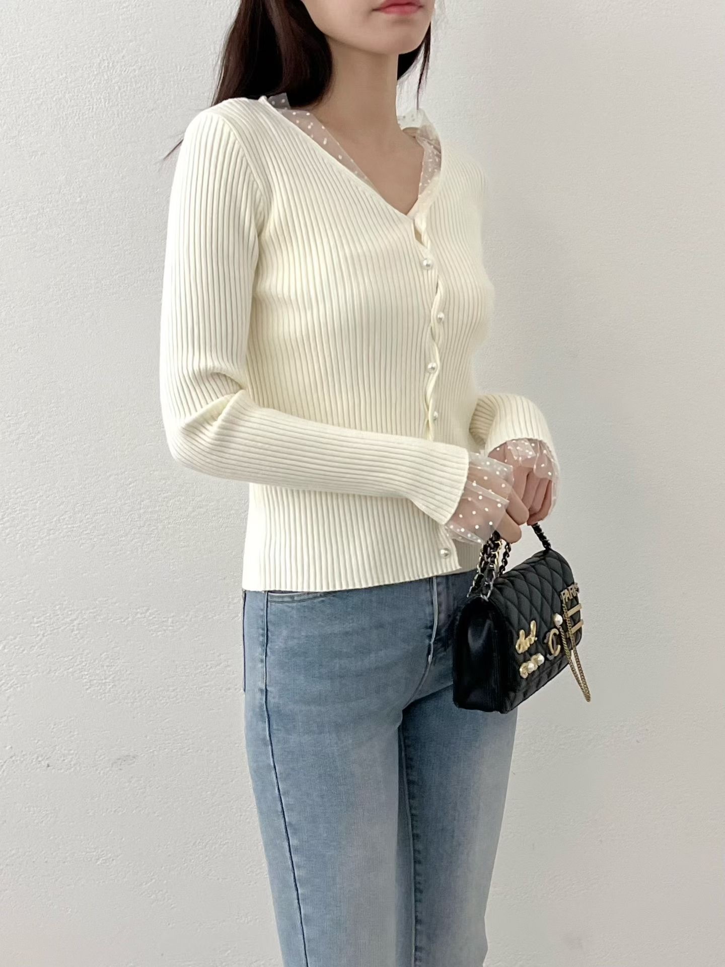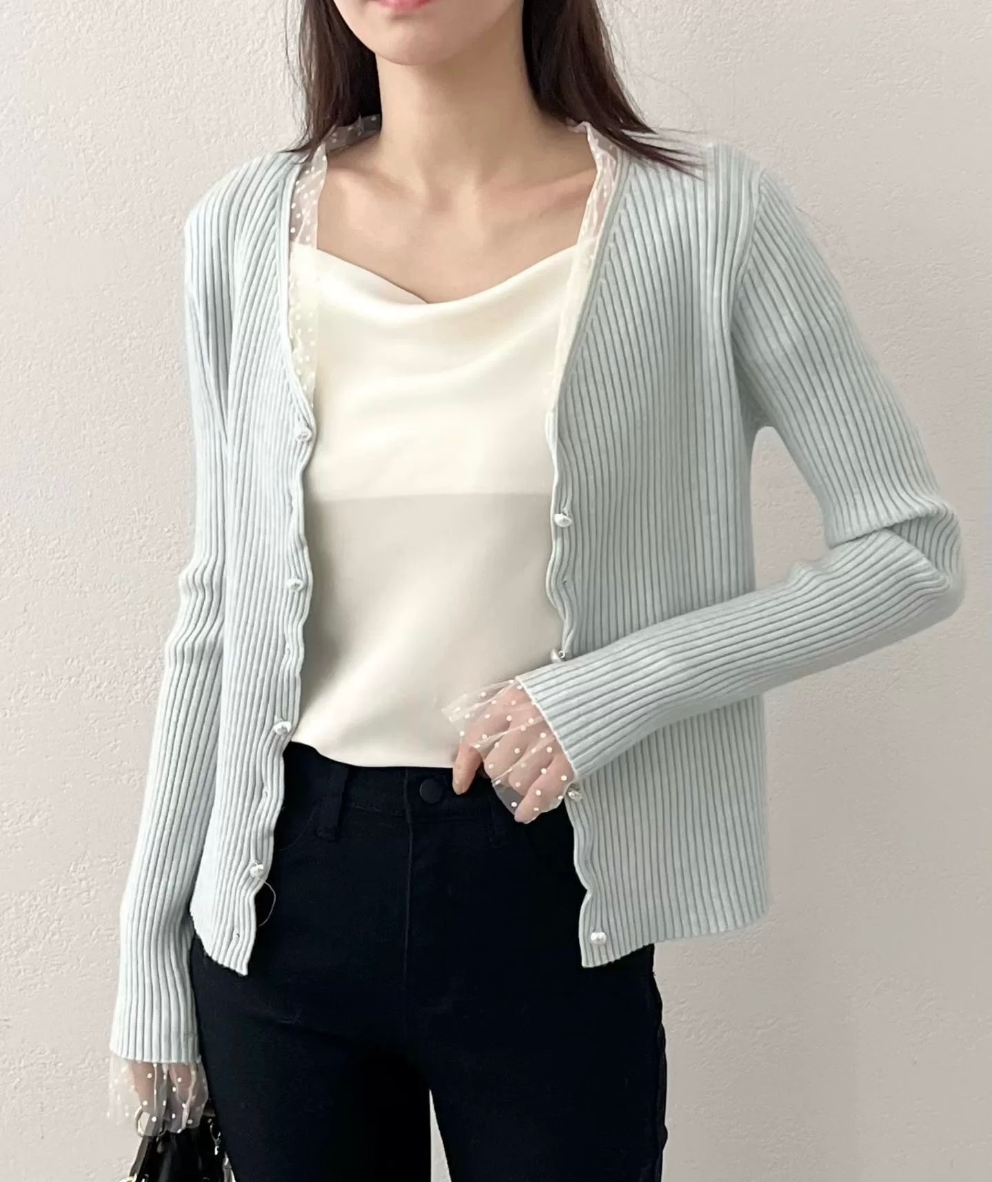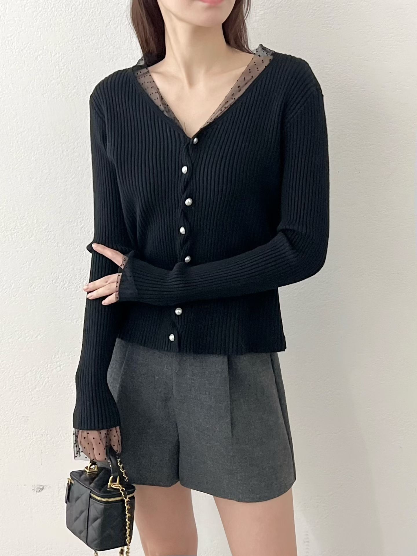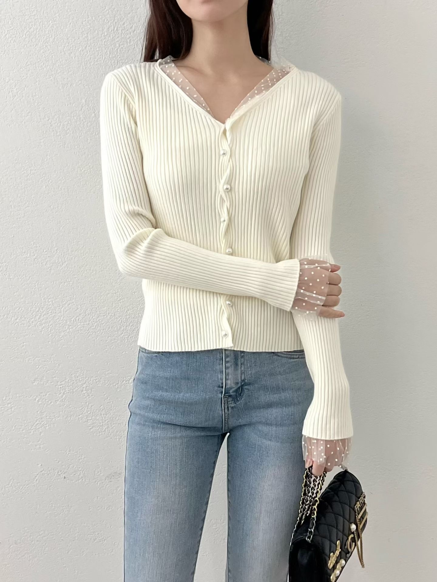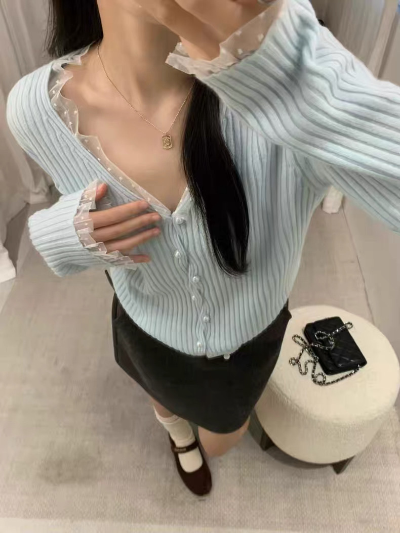 ❁Dot lace ruffle pearl twist button cardigan ❁