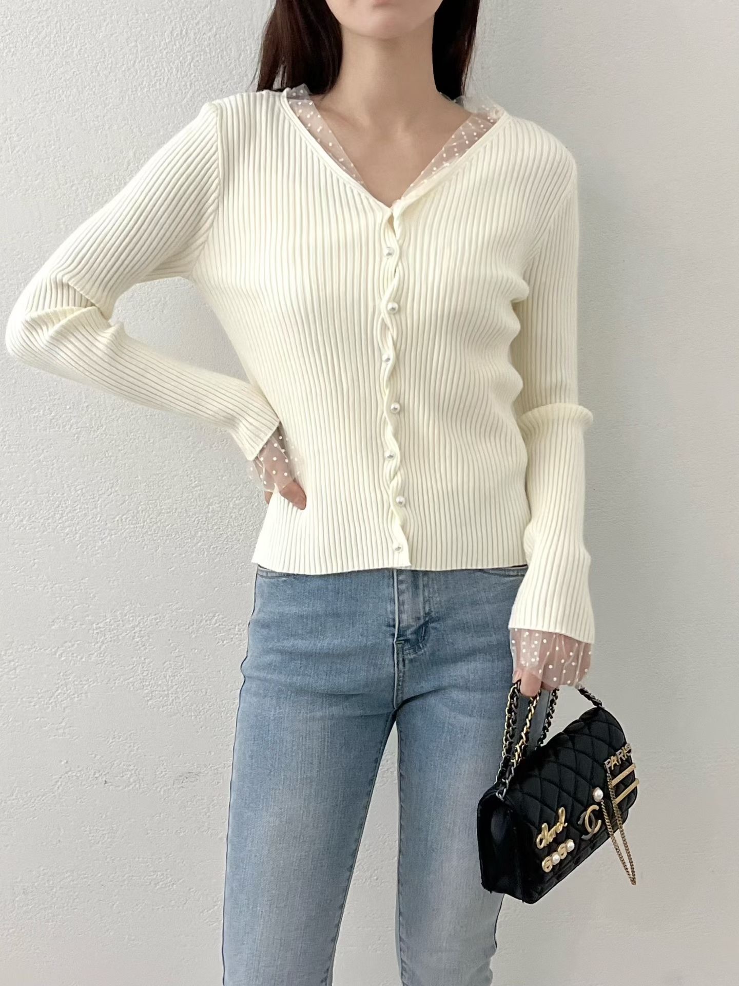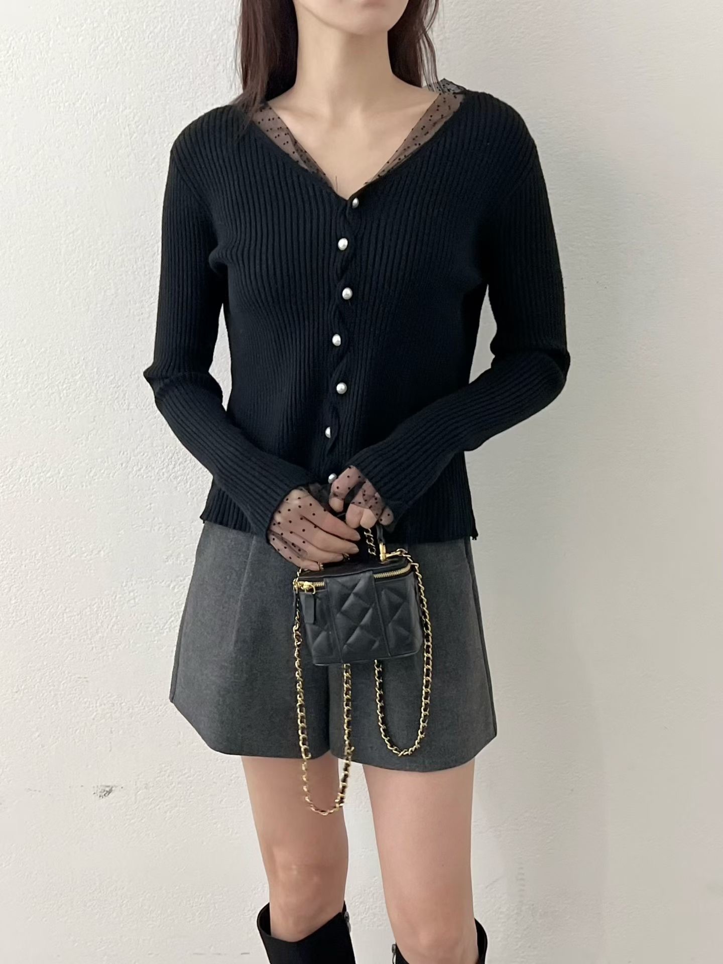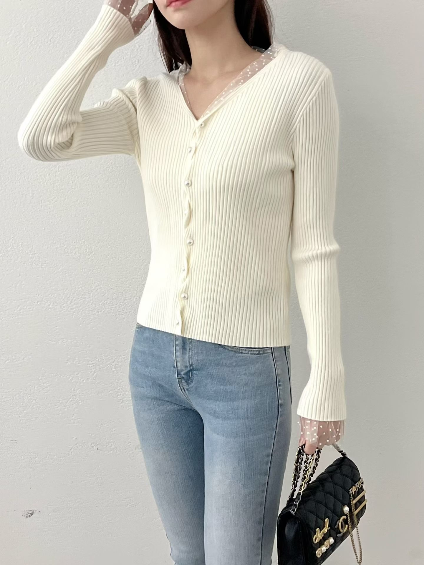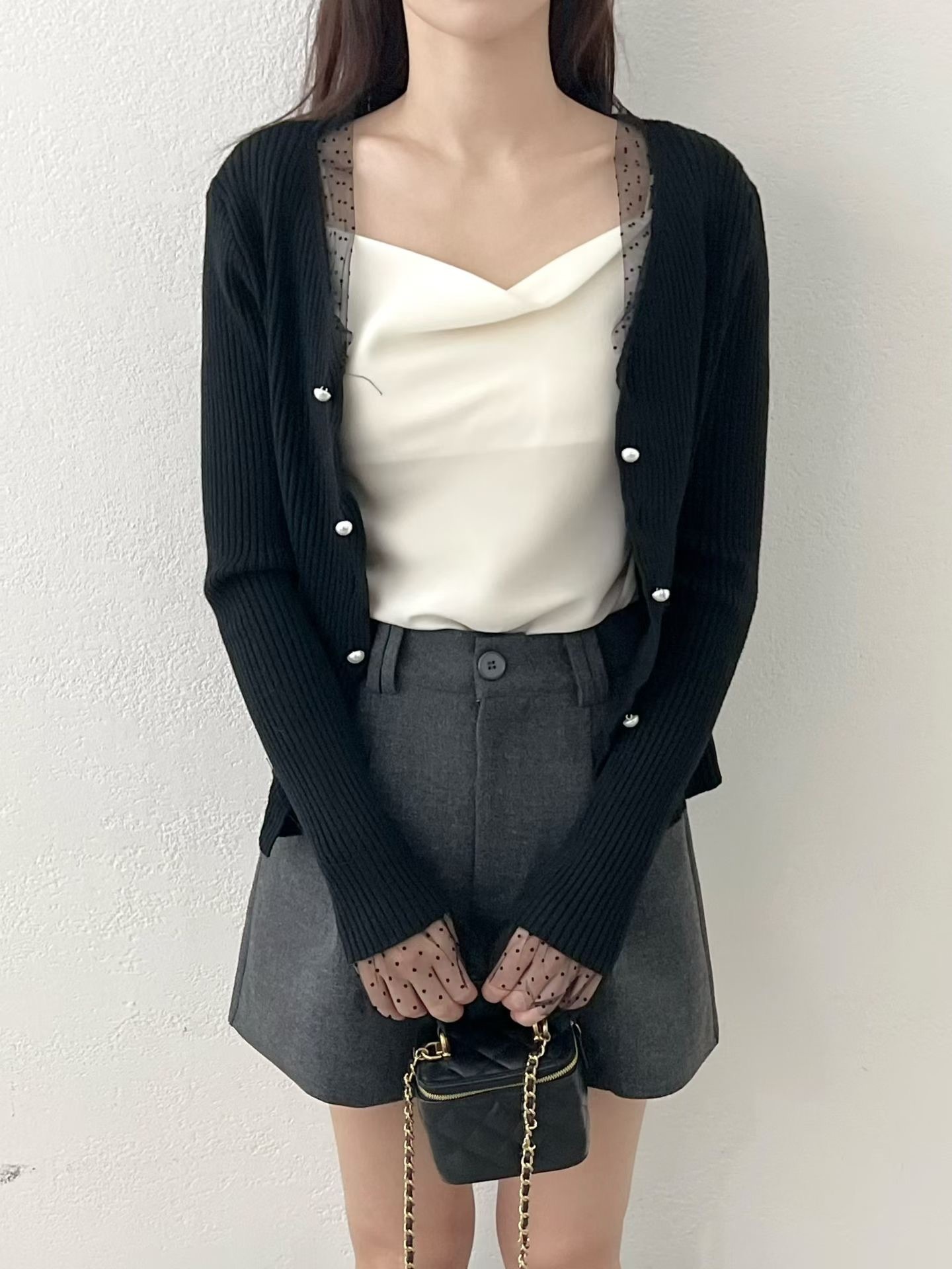 ❁Dot lace ruffle pearl twist button cardigan ❁