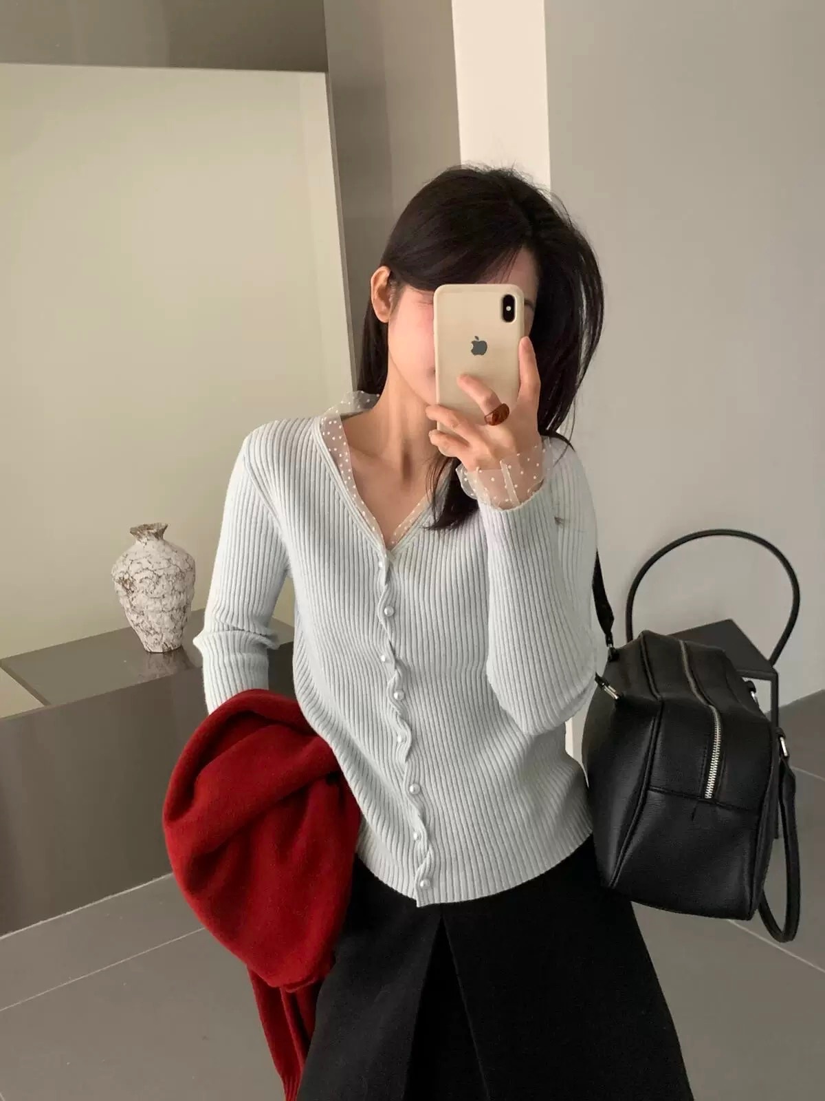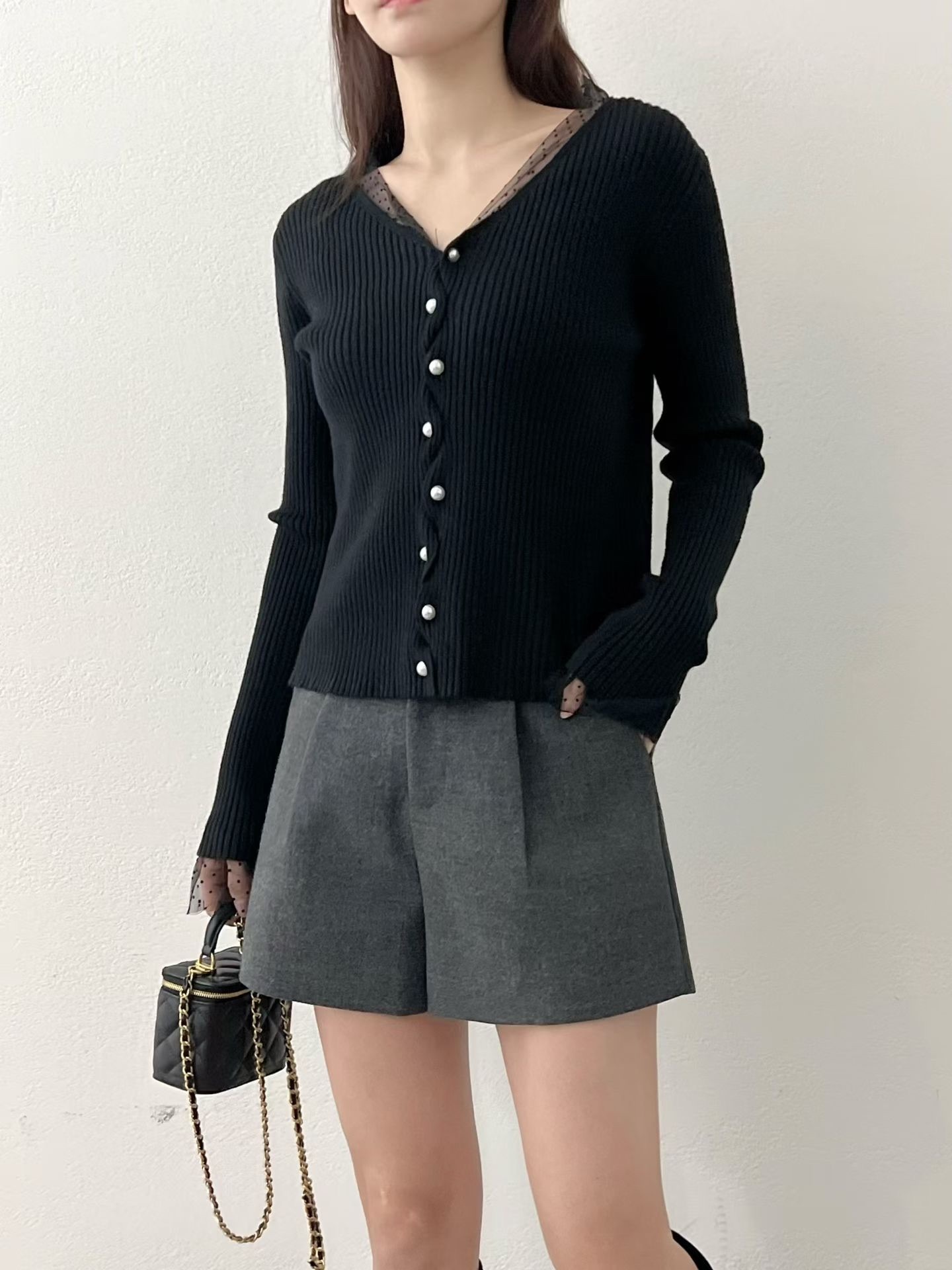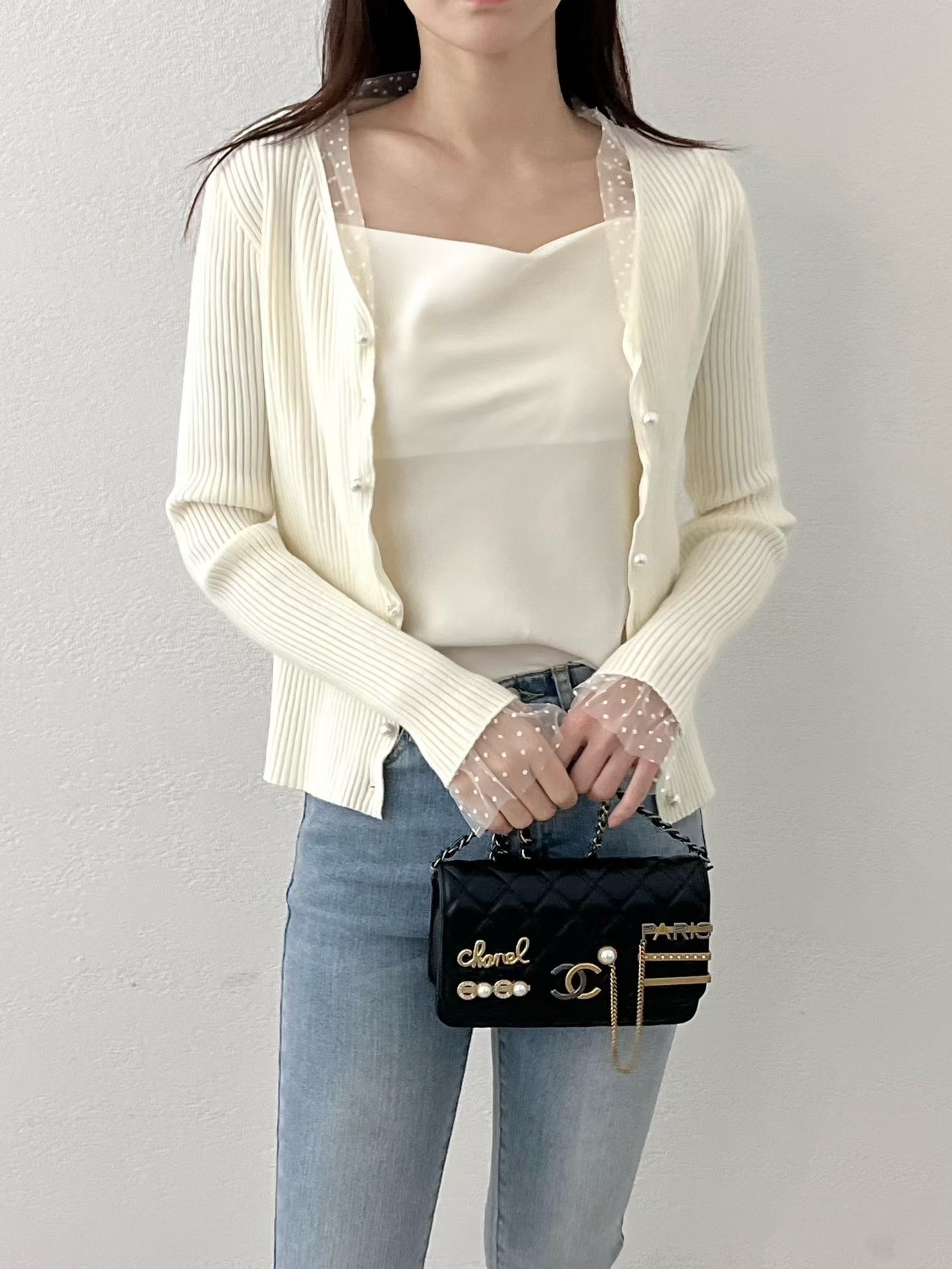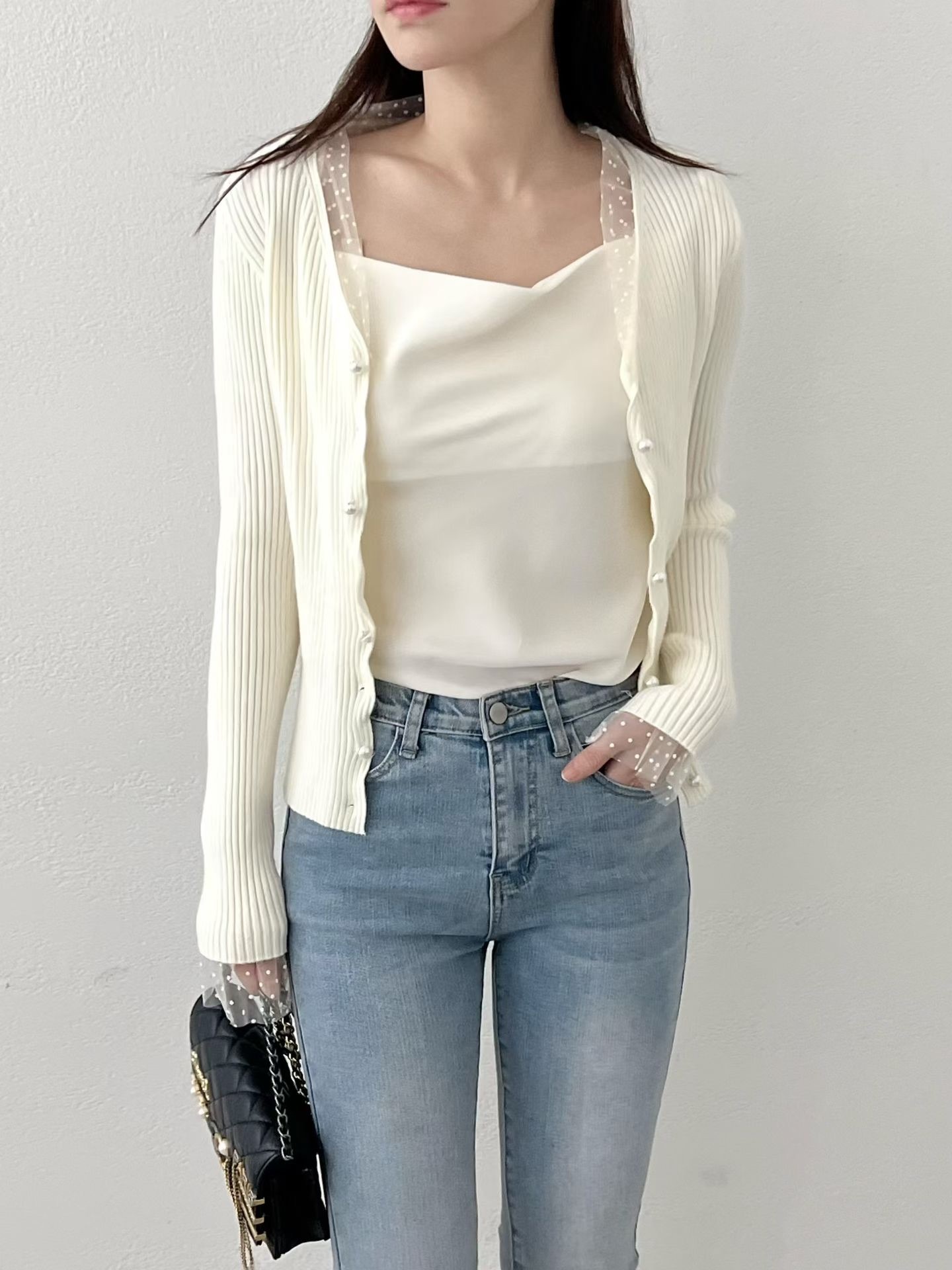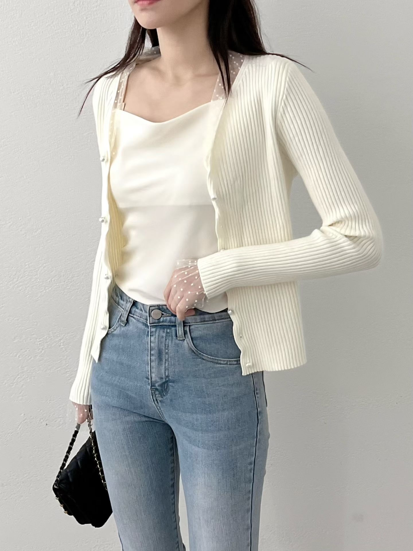❁Dot lace ruffle pearl twist button cardigan ❁